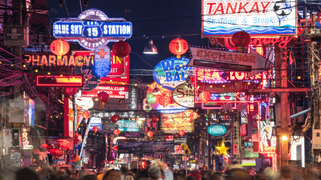 芭提雅海滩路的尽头,有一条街巷在白天看起来和其它地方无异,却像变幻魔术般在夜晚大放异彩。正是游芭提雅必打卡的鼎鼎有名步行街,满街的夜总会、啤酒吧、餐厅或舞厅在六点入夜后被开启了开关,夜幕下,霓虹灯、不同风格的震耳音乐、食品小贩、街头表演和来自世界各地的各色游客填满了这条街的每处缝隙。